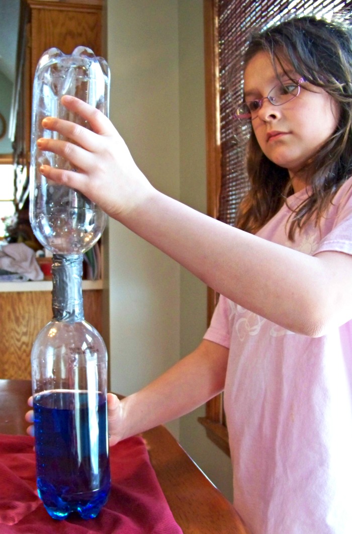 Once you have the bottles taped together, be sure all the water is in the bottom bottle.